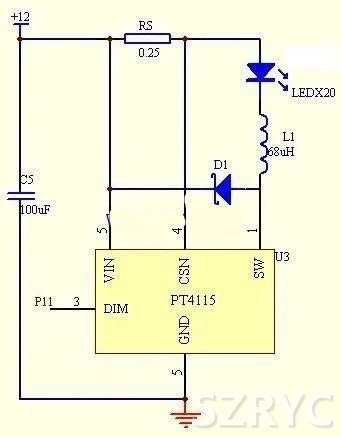 本設(shè)計(jì) L ED 光源采用相互并聯(lián)方式,共由20 只5mm 高亮度小功率LED 燈珠組成;每只LED 燈珠的壓降約3.1V,工作電流約20mA.由白光LED 的正向伏安特性可知,當(dāng)LED 端電壓超過其正向?qū)妷汉螅^小的電壓波動(dòng)都會(huì)導(dǎo)致工作電流的的劇烈變化,從而影響LED 的正常使用,固LED 宜采用恒流驅(qū)動(dòng)方式。因此,本設(shè)計(jì)LED 采用高性能PT4115 恒流芯片驅(qū)動(dòng),PT4115 是一款連續(xù)電感電流導(dǎo)通模式的降壓恒流源芯片,能將直流電壓直接轉(zhuǎn)換成穩(wěn)定的恒流輸出;其采用6~30V 寬電壓輸入,輸出電流可達(dá)1.2A,轉(zhuǎn)換效率高達(dá)97%,輸出電流精度達(dá)±5%.該芯片內(nèi)部含有抖頻特性,極大的改善EMI,同時(shí)具有過溫、過壓、過流、LED 開路保護(hù)等多種功能。該芯片適合用于綠色照明LED燈的驅(qū)動(dòng)電路,具有應(yīng)用電路非常簡潔的優(yōu)點(diǎn)。LED 恒流驅(qū)動(dòng)電路如圖3 所示。
