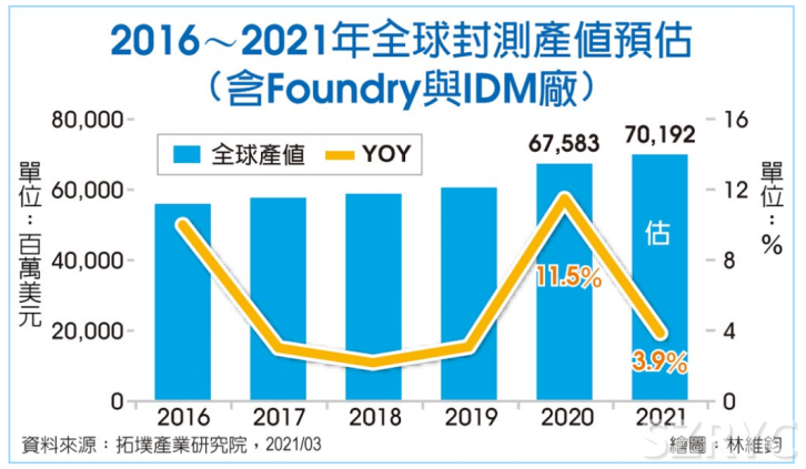 展望2021年,中美貿(mào)易摩擦的狀態(tài)仍視美國新任總統(tǒng)拜登是否改變或調(diào)整戰(zhàn)略目標而訂,目前預(yù)估今年中國封測營收年增幅度將持續(xù)縮減至1.5%。進一步觀察中國封測代工業(yè)營收表現(xiàn),由于現(xiàn)行主流廠商營收來源多數(shù)仍來自中國內(nèi)需市場,且主要封測需求也以中、低階產(chǎn)品為主,因此相關(guān)產(chǎn)業(yè)受貿(mào)易摩擦的沖擊相對較小,2020年中國封測代工業(yè)營收有望達到6.68億美元,年增9.6%,預(yù)期2021年營收也將隨著后疫情時代的新生活型態(tài)帶動而逐步上揚。