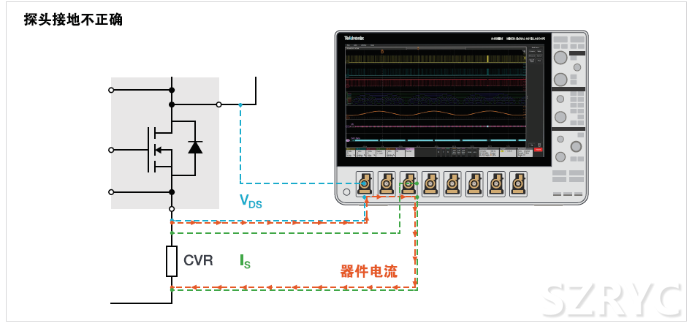 圖3. 在兩只參考地電平的探頭連接到不同電壓的參考平面時,器件電流會旁路CVR,流經地線和示波器。這會導致測量錯誤,并可能會導致設備損壞。