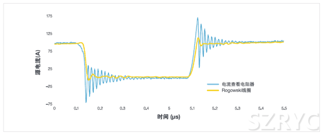 圖5. CVR 與Rogowski 電流探頭, CAB011M12FM3 (TJ= 150℃ , RG = 1W), VDS= 600 V, IS = 100A)。