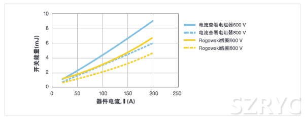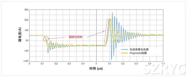 圖5 在更加激進的開關條件下比較了不同的探頭,比較中突出了兩個關心的點。第一,在關閉時,Rogowski 線圈不能充分捕獲電流波形的形狀,漏掉了輕微的膝部,會降低表面上的開關損耗。此外,打開時預測的di/dt 下降還會導致預測的開關損耗降慢。Rogowski 線圈帶寬下降的累積效應,是估算的開關損耗降低。