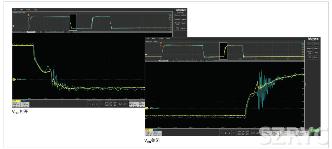 圖2 比較了標準差分探頭與光隔離探頭進行的高側柵極電壓測量。不管是關閉還是打開,在器件柵極經過閾值區(qū)域后,柵極上都可以看到高頻振鈴。由于柵極和功率環(huán)路之間的耦合,預計會出現部分振鈴。但是,在差分探頭中,振鈴的幅度明顯要高于光隔離探頭測得的值。這可能是由于參考電壓變化在探頭內部引起了共模電流及標準差分探頭的假信號。雖然圖2 中差分探頭測得的波形似乎通過了器件的最大柵極電壓,但光隔離探頭的測量準確度要更高,明確顯示器件位于規(guī)范范圍內。