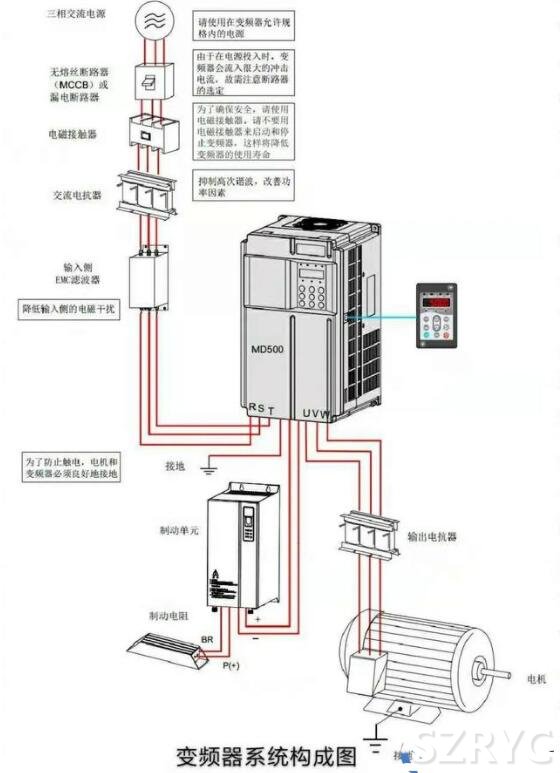三相變頻器主回路接線端子即功能見(jiàn)下圖所示。