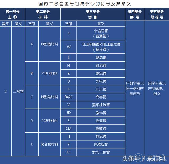 (1)按照國產(chǎn)半導(dǎo)體器件型號命名方法:二極管的型號命名由五個部分組成:主稱、材料與極性、類別、序號和規(guī)格號(同一類產(chǎn)品的檔次)。