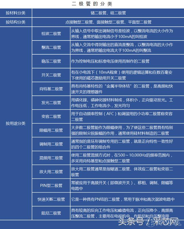 二極管的種類有很多,按照所用的半導(dǎo)體材料,可分為鍺二極管(Ge管)和硅二極管(Si管);按照管芯結(jié)構(gòu),又可分為點接觸型二極管、面接觸型二極管及平面型二極管。