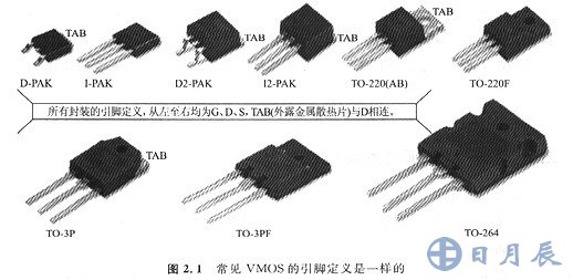 除了小型封裝的VMOS場以外,多數(shù)MOS場效應(yīng)管單管的引腳排列順序是一樣的(圖2.1),極少有例外。讓VMOS的引腳向下,使有字的一面朝向自己,那么從左至右就是G(柵極)、D(漏極)、S(源極),TAB表示散熱片,與漏極相通。小型封裝、多管封裝等則需要查閱器件的技術(shù)手冊,沒有統(tǒng)一規(guī)律可循。