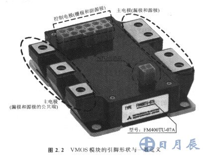VMOS模塊是最為常見的場效應(yīng)管模塊,塑料外殼上一般有引腳定義的標(biāo)識。引腳標(biāo)識無外乎兩種方法:一種是直接在引腳附近用寧母標(biāo)識,如G、D、S、SID2(兩管的公共端)等;另一種足引腳用阿拉伯?dāng)?shù)字標(biāo)識,在模塊的側(cè)面有內(nèi)部的等效電路原理圖和引腳編號。另外,模塊上主電極與副電極從外形上也 是比較容易區(qū)分的,因為它們的大小、形狀的差異非常明顯(圖2.2)。