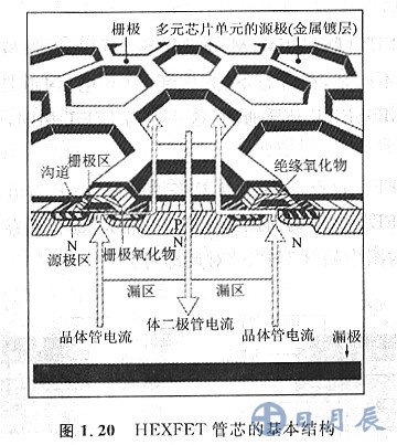 HEXMOS就是門(mén)前最主流的一種MOSFET“管芯單元”的規(guī)劃方式(圖1. 20),專利是美國(guó)IR公司的。由于“管芯單元”的規(guī)劃外形呈”Hcxagonal(六邊形)而得名。