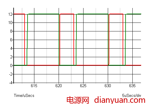 紅色波形為驅(qū)動(dòng)源V1的輸出,綠色為Q1的G級(jí)波形??梢钥吹?,Q1-G的波形為具有正負(fù)電壓的方波,幅值6V了。