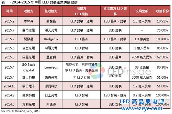 中國大陸LED產(chǎn)業(yè)發(fā)展?jié)u趨成熟,并購潮銳不可擋,其中由封裝產(chǎn)業(yè)率先拉開序幕。2014年開始,中國大陸LED封裝行業(yè)開始出現(xiàn)并購案例,而今年開始并購潮正式來臨,包括Lumileds、Bridgelux等國際廠商亦參與其中。