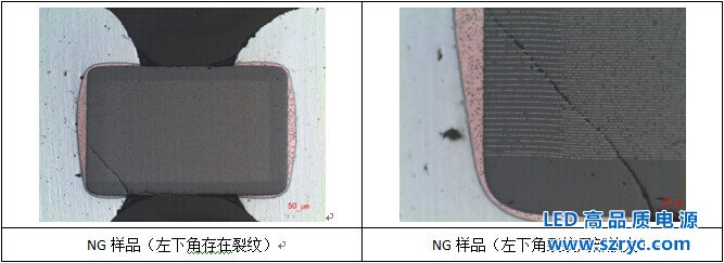 樣品失效的主要原因?yàn)镸LCC內(nèi)部存在機(jī)械應(yīng)力裂紋,而該裂紋的產(chǎn)生應(yīng)該與其焊接操作存在較大關(guān)系。原則上陶瓷貼片電容一般應(yīng)由SMT專用設(shè)備焊接,假如非要手工焊接時,一定要嚴(yán)格按工藝要求進(jìn)行,多次焊接包括返工會影響貼片的可焊性及對焊接熱量的抵抗力,并且效果是累計的,因此不宜讓電容多次接觸到高溫。當(dāng)電容兩端上錫不對稱或焊錫過多時,會嚴(yán)重影響陶瓷電容抵抗機(jī)械應(yīng)力的能力,而產(chǎn)生電容失效。