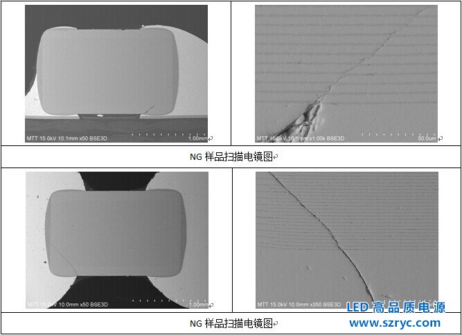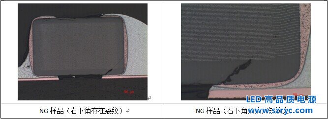 對切片進(jìn)一步采用SEM/EDS分析,OK樣品未發(fā)現(xiàn)明顯異常,NG樣品均存在明顯裂紋,除此之外,未發(fā)現(xiàn)明顯異常。