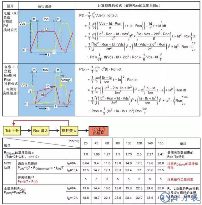 ●導(dǎo)通電阻RDS(on)損耗(高溫時(shí)RDS(on)增大,導(dǎo)致一定電流下,功耗增加)