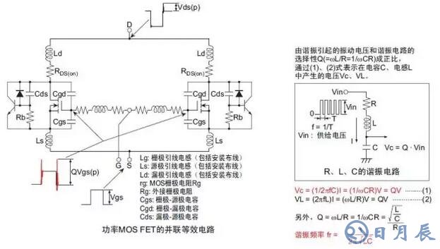在并聯(lián)功率MOS FET時(shí)未插入柵極電阻而直接連接時(shí)發(fā)生的柵極寄生振蕩。高速反復(fù)接通、斷開(kāi)漏極-源極電壓時(shí),在由柵極-漏極電容Cgd(Crss)和柵極引腳電感Lg形成的諧振電路上發(fā)生此寄生振蕩。當(dāng)諧振條件(ωL=1/ωC)成立時(shí),在柵極-源極間外加遠(yuǎn)遠(yuǎn)大于驅(qū)動(dòng)電壓Vgs(in)的振動(dòng)電壓,由于超出柵極-源極間額定電壓導(dǎo)致柵極破壞,或者接通、斷開(kāi)漏極-源極間電壓時(shí)的振動(dòng)電壓通過(guò)柵極-漏極電容Cgd和Vgs波形重疊導(dǎo)致正向反饋,因此可能會(huì)由于誤動(dòng)作引起振蕩破壞。