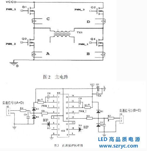 半橋和全橋是開關(guān)電源常用的拓?fù)浣Y(jié)構(gòu),“直通”對其有很大的威脅,直通是同一橋臂兩只晶體管在同一時間內(nèi)同時導(dǎo)通的現(xiàn)象。在換流期,開關(guān)電源易受干擾而造成直通,過大的直通電流會損壞用于逆變的電力電子器件。一旦出現(xiàn)直通現(xiàn)象,須盡快檢測到并立即關(guān)斷驅(qū)動,以避免開關(guān)器件的PN結(jié)積累過大的熱量而燒壞。這里利用雙單穩(wěn)態(tài)集成觸發(fā)器CD4528設(shè)計了一種針對全橋和半橋的直通檢測、保護(hù)電路。