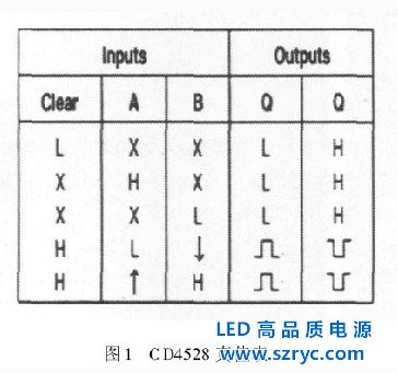 CD4528含兩個單穩(wěn)態(tài)觸發(fā)器,其真值表如圖1.芯片3腳與13腳分別為其內(nèi)部兩個獨立單穩(wěn)態(tài)電路的Clear端,5腳和11腳為單穩(wěn)態(tài)的B輸入端,4腳與12腳為單穩(wěn)態(tài)的A輸入端。B端接高電平,只有當(dāng)Clear端為高電平時,A端輸入的上升沿觸發(fā)才會有效。