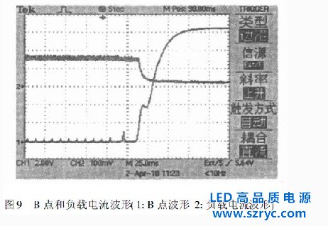 光耦U1、U 2 隨被測電源的正負(fù)半周交替導(dǎo)通,當(dāng)A 點交流電壓大于光耦中發(fā)光二極管的導(dǎo)通電壓Von時,光耦開啟,C3通過光耦中三極管放電,使B 點的電壓達(dá)不到場效應(yīng)管的開啟電壓; 當(dāng)交流電壓小于Von時,光耦不導(dǎo)通,C3充電,B點的電壓增加,此時應(yīng)使C3的電壓上升到場效應(yīng)管閾值的時間大于光耦關(guān)閉的時間,以保證Q2不導(dǎo)通。 在t1時刻交流電源斷開,光耦輸出呈高阻態(tài),C2中存儲的電荷經(jīng)R1向C3充電,C3上的電壓迅速增加,當(dāng)B點電壓大于場效應(yīng)管的開啟電壓時,場效應(yīng)管Q2導(dǎo)通,導(dǎo)通后可迅速將Vs 拉低,圖8中Vs是調(diào)節(jié)器的給定輸入端電壓。 關(guān)機(jī)瞬間負(fù)載電流和圖8中B點的波形如圖9.改變R1和R4的參數(shù),可以改變給C3充電的時間。 R4選用較大阻值的,可以提高C3上的電壓,同時延長C3的放電時間。 C2的大小可以決定交流電源斷電后維持該電路工作的時間。 綜上所述,設(shè)置合理的參數(shù),便可保證在主電路電源沒有完全關(guān)閉的情況下,Q2一直導(dǎo)通,即誤差放大器的給定輸入端一直為零,避免了電流過沖。