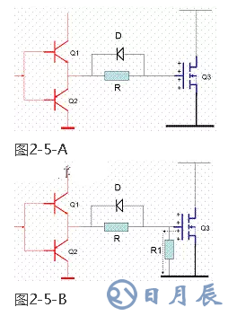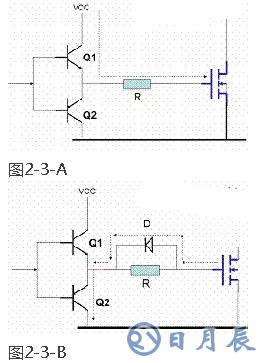 由于MOS管在制造工藝上柵極S的引線的電流容量有一定的限度,所以在Q1在飽和導(dǎo)通時(shí)VCC對(duì)MOS管柵極S的瞬時(shí)充電電流龐大,極易損壞MOS管的輸入端,為了維護(hù)MOS管的安全,在細(xì)致的電路中必需采取措施限制瞬時(shí)充電的電流值,在柵極充電的電路中串接一個(gè)恰當(dāng)?shù)某潆娤蘖麟娮鑂,如圖2-3-A所示。充電限流電阻R的阻值的選取;要根據(jù)MOS管的輸入電容的大小,鼓舞脈沖的頻率及灌流電路的VCC(VCC普通為12V)的大小決議普通在數(shù)十姆歐到一百歐姆之間。