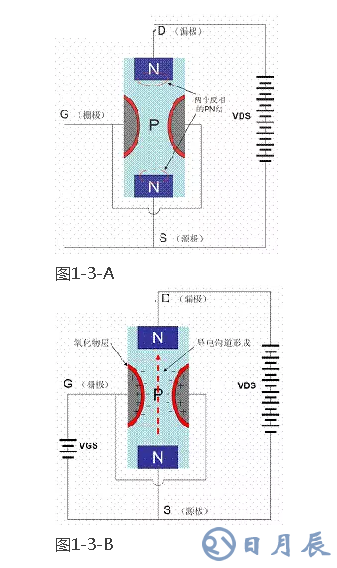 MOS管應(yīng)用電壓的極性和我們普通的晶體三極管相同,N溝道的類似NPN晶體三極管,漏極D接正極,源極S接負(fù)極,柵極G正電壓時(shí)導(dǎo)電溝道建立,N溝道MOS管開(kāi)始工作,如圖1-4-B所示。同樣P道的類似PNP晶體三極管,漏極D接負(fù)極,源極S接正極,柵極G負(fù)電壓時(shí),導(dǎo)電溝道建立,P溝道MOS管開(kāi)始工作,如圖1-5-B所示。