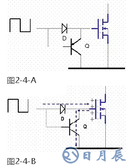 D為充電二極管,Q為放電三極管(PNP)。工作過(guò)程是這樣,當(dāng)鼓舞方波正半周時(shí),D導(dǎo)通,對(duì)MOS管輸入端等效電容充電(此時(shí)Q截止),在當(dāng)鼓舞方波負(fù)半周時(shí),D截止,Q導(dǎo)通,MOS管柵極S所充電荷,經(jīng)過(guò)Q放電,MOS管完成“開(kāi)”與“關(guān)”的動(dòng)作,如圖2-4-B所示。此電路由鼓舞信號(hào)直接“灌流”,鼓舞信號(hào)源懇求內(nèi)阻較低。該電路普通應(yīng)用在功率較小的開(kāi)關(guān)電源上。