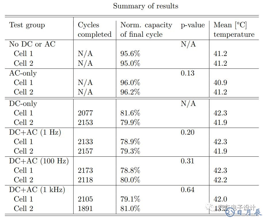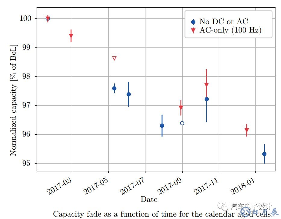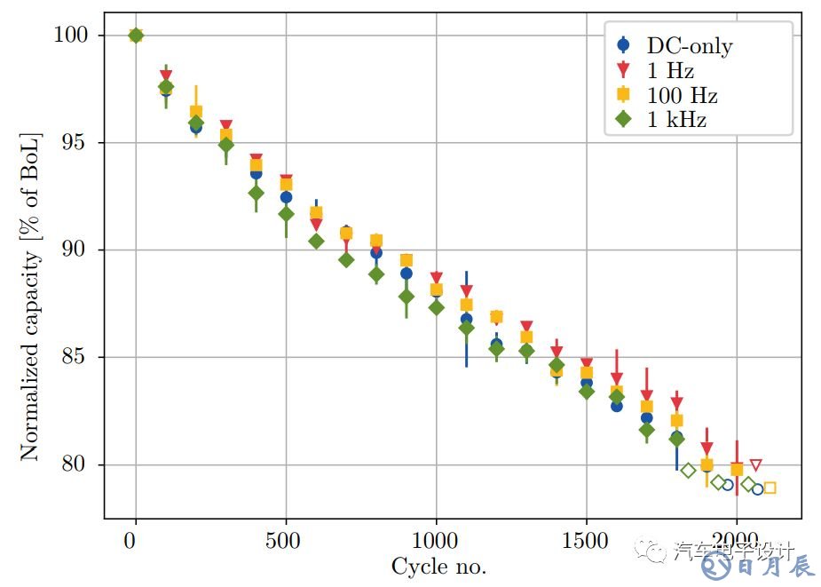 這個(gè)實(shí)驗(yàn)經(jīng)歷了一年的測試周期,大約2000次循環(huán),大約損失了原始容量的約20%。容量衰減量與是否疊加紋波電流(交流頻率)無關(guān)