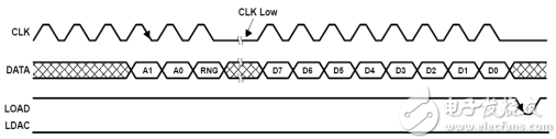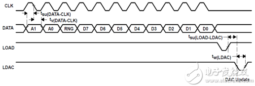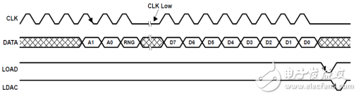 如圖1所示:當LOAD為高電平時,數(shù)據(jù)在CLK的下降沿被鎖存至DATA,只要所有數(shù)據(jù)被鎖存,則將LOAD拉低,將數(shù)據(jù)從串行輸入寄存器傳送到所選擇的DAC。