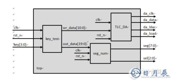13 //內(nèi)部信號:模塊內(nèi)部的接口信號,比如模塊TLC_DA的輸出信號data_in,通過內(nèi)部信號r_data與模塊key_test的輸入信號wr_data相連