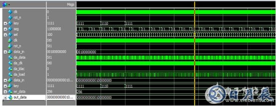 由于仿真時間原因,這里只測試按鍵1按下時的數(shù)碼管顯示,顯示為00100,表示通道A,RNG為1,輸入數(shù)字量為00。之后實際下板驗證,用萬用表也可測出輸入數(shù)字量對應的電壓值。