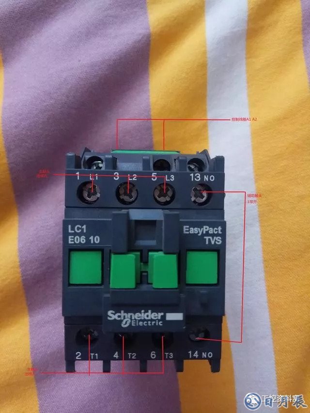 如上圖所示,接觸器共有六個主觸點,1,3,5為主觸點進(jìn)線孔,2,4,6為主觸點出線孔,A1,A2為接觸器線圈的兩個接線端子,在接觸器的主觸點的稍下方。也有的接觸器A2有兩個接點,我們在運用的時候隨便接哪一個都行。線圈接線不分零火。