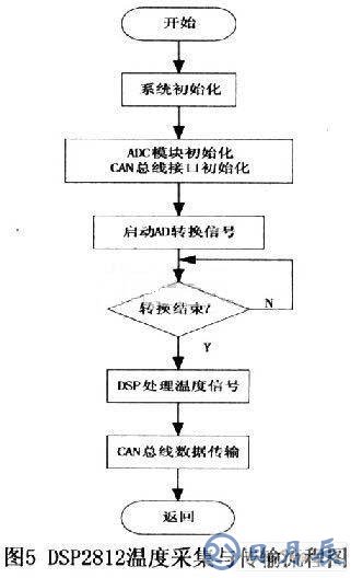 系統(tǒng)主站主要完成遠程監(jiān)控與數(shù)據(jù)存儲、打印、顯示,與下位機通訊顯示輸送機溫度,轉(zhuǎn)送,故障報警等功能?,F(xiàn)場DSP程序主要包括兩部分功能:溫度檢測 ADC轉(zhuǎn)換與CAN總線通信。DSP2812溫度采集與傳輸流程圖如圖5所示。CAN總線通信時各智能節(jié)點通過CAN總線不斷向上位機發(fā)送測試數(shù)據(jù),上位機通過指令方式設置溫度上下限并對報警溫度做出處理。